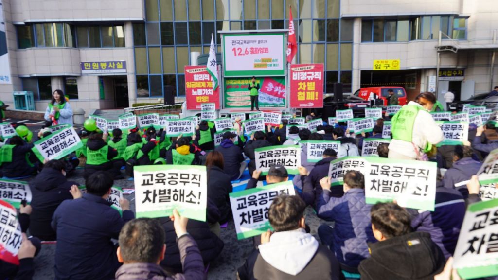 전국교육공무직본부 광주지부가 6일 오전 10시 광주시교육청 앞에서 집회를 열고 '교육공무직 차별 해소!' 손팻말을 흔들고 있다. 송보현 기자