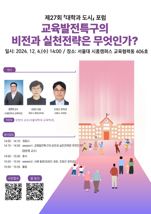 경기 파주시(시장 김경일)는 지난 4일 ‘서울대학교 대학과 도시 포럼’에서 주관하는 ‘제27회 대학과 도시 포럼‘에 참석해 파주시 교육발전특구의 비전과 전략에 대해 발표했다고 6일 밝혔다.