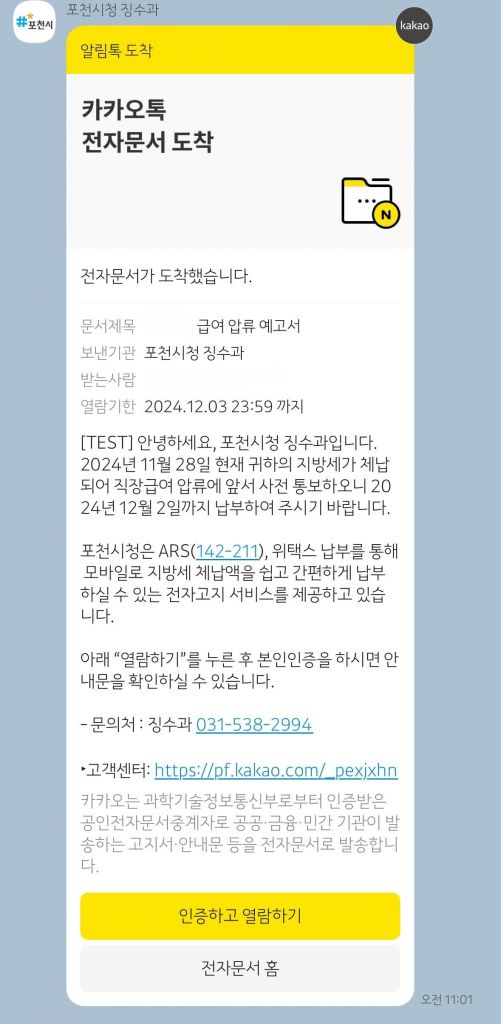 각종 체납 관련 안내문을 카카오톡 모바일 전자문서로 발송. 포천시 제공