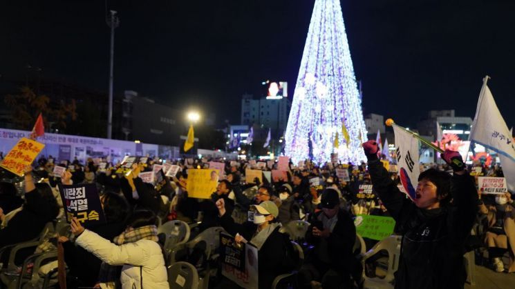 5일 오후 광주 5·18민주광장에서 진행된 2차 총궐기대회에서 시민들이 윤석열 퇴진을 촉구하고 있다. 송보현 기자