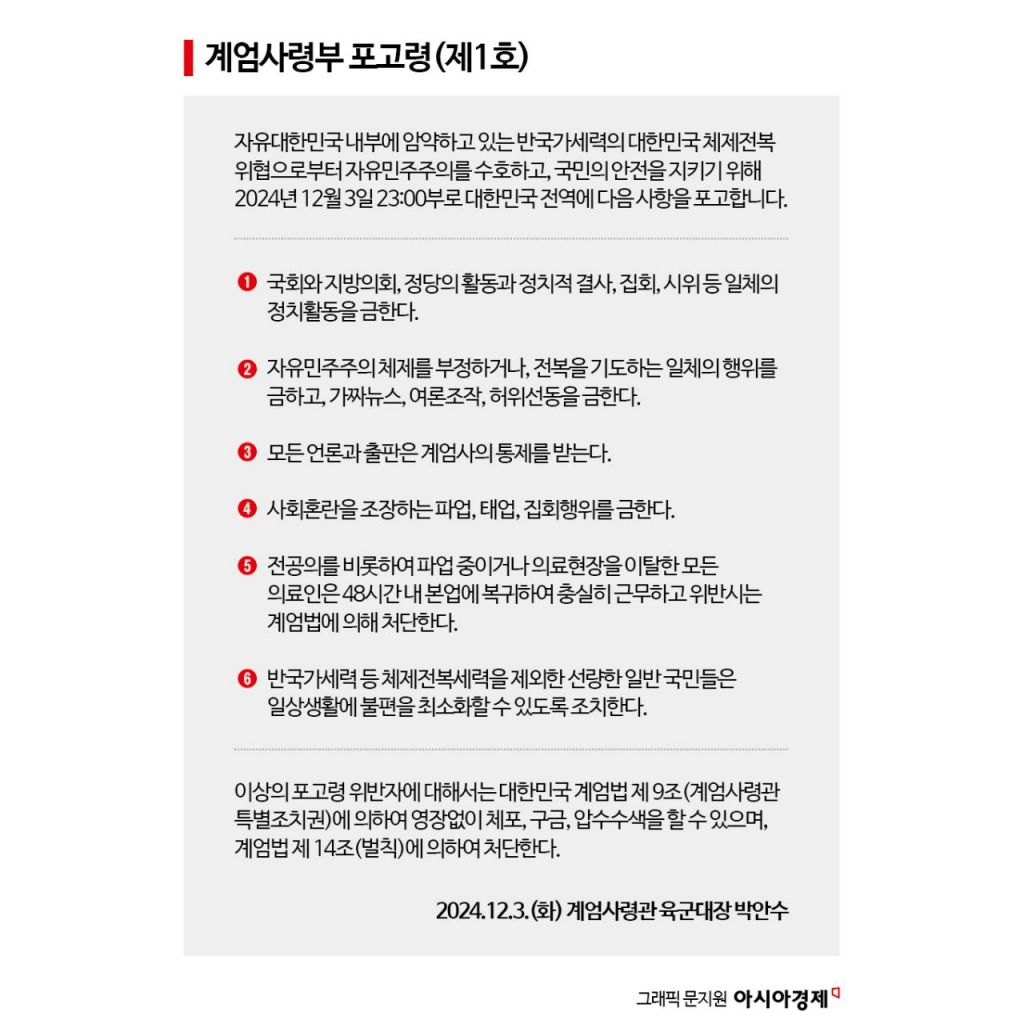 일반 국민들의 일상생활을 보장하겠다는 내용도 같다. 2024년 포고령 제1호에서 '선량한 일반 국민들은 일상생활에 불편을 최소화할 수 있도록 조치한다'는 내용이 담겼는데, 이는 1980년 포고령 제10호에 '국민의 일상생활과 정상적 경제활동의 자유는 보장한다'는 내용과 유사하다.