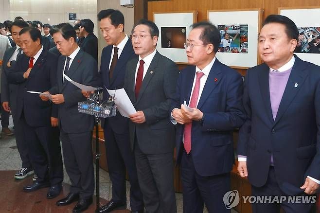 국민의힘 시·도지사협의회 소속 광역단체장들이 6일 오후 서울 중구 프레스센터에서 긴급 회의를 마치고 입장을 발표하고 있다. 연합뉴스