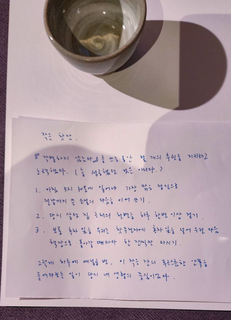 그는 함께 준비해 둔 메모에 "'작별하지 않는다'를 쓰는 동안 몇 개의 루틴을 지키려고 노력했다. (늘 성공했던 것은 아니다.)"라고 소개했다.