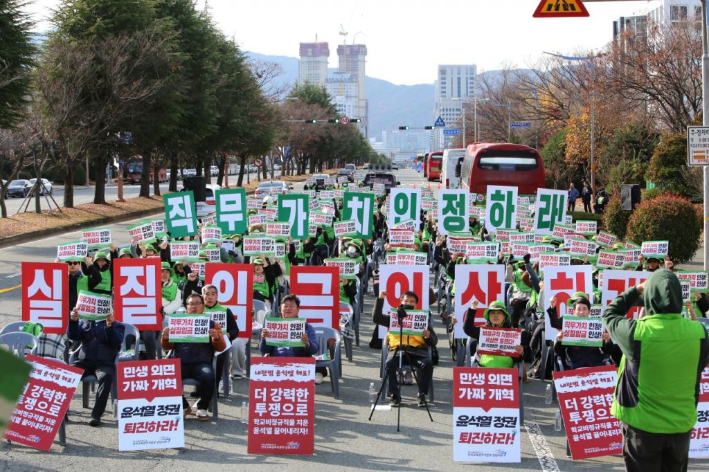 연대회의에 속한 전국교육공무직본부 경남지부는 이날 도 교육청 앞에서 총파업 결의대회를 열고 ▲기본급 및 근속 수당 인상 ▲정규직과 같은 기준 적용한 복리후생 수당 지급 ▲임금체계 개편 ▲직무보조비 신설 등을 촉구했다.