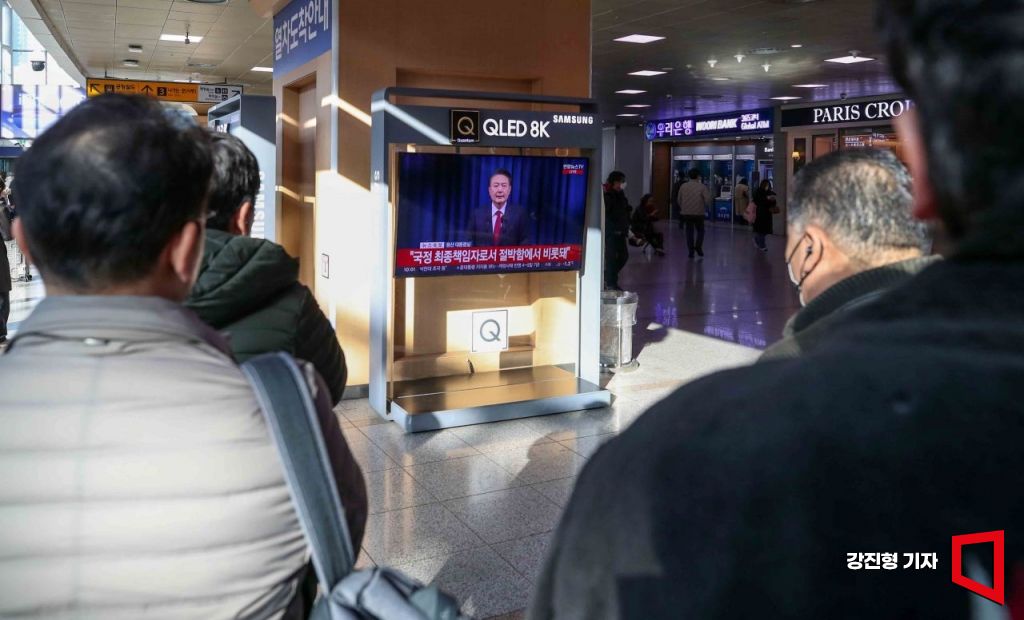 윤석열 대통령 탄핵소추안 표결일인 7일 서울역 대합실에서 시민들이 윤 대통령의 대국민담화를 지켜보고 있다.