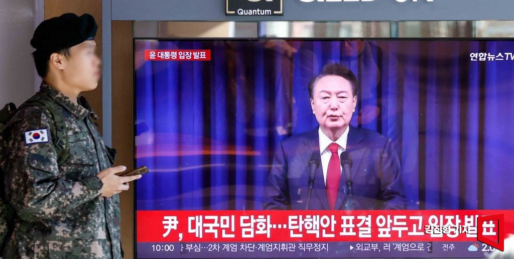 윤석열 대통령 탄핵소추안 표결일인 7일 서울역 대합실에서 시민들이 윤 대통령의 대국민담화를 지켜보고 있다.