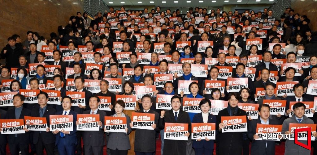 이재명 대표를 비롯한 더불어민주당 의원들이 7일 국회에서 윤석열 대통령 담화 규탄 의원총회를 하고 있다.