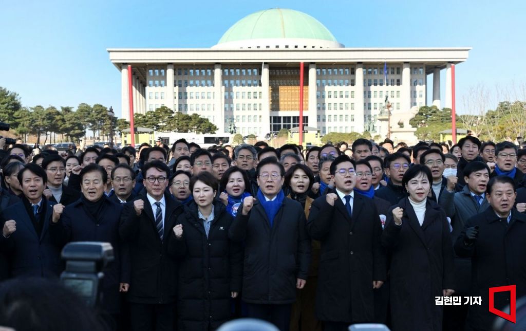 이재명 대표를 비롯한 더불어민주당 의원들이 7일 국회에서 윤석열 대통령 담화 규탄 의원총회를 마치고 국회 정문으로 나와 시민들에게 인사하고 있다.