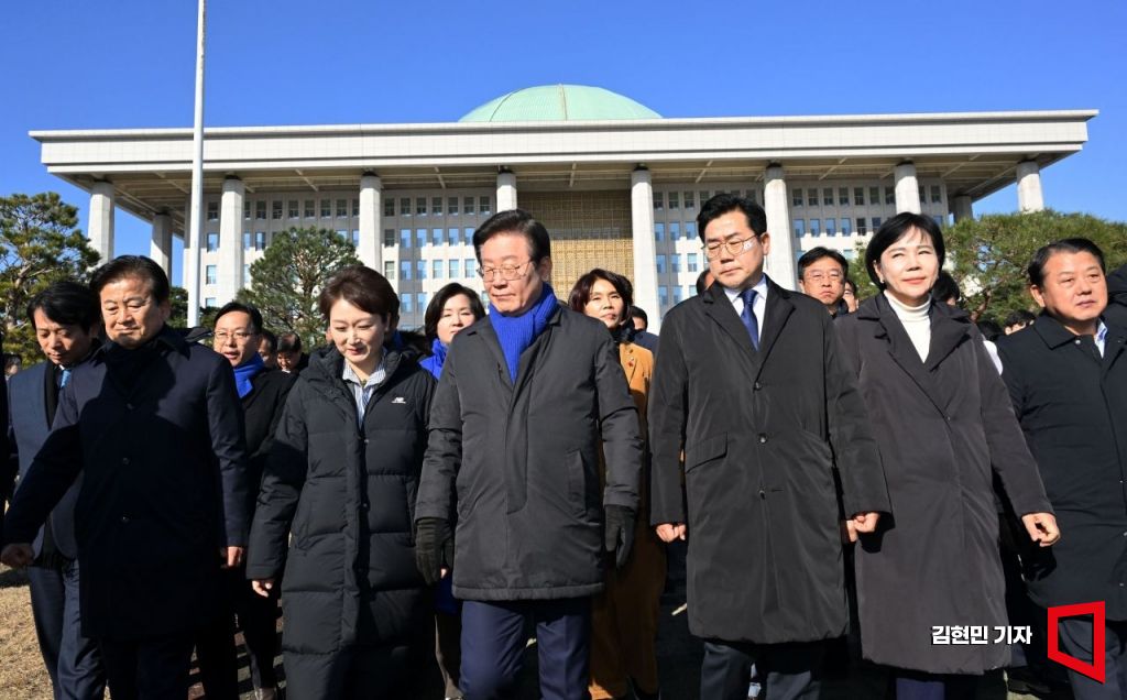 이재명 대표를 비롯한 더불어민주당 의원들이 7일 국회에서 윤석열 대통령 담화 규탄 의원총회를 마치고 시민들에게 인사하기 위해 국회 정문으로 향하고 있다. 김현민 기자