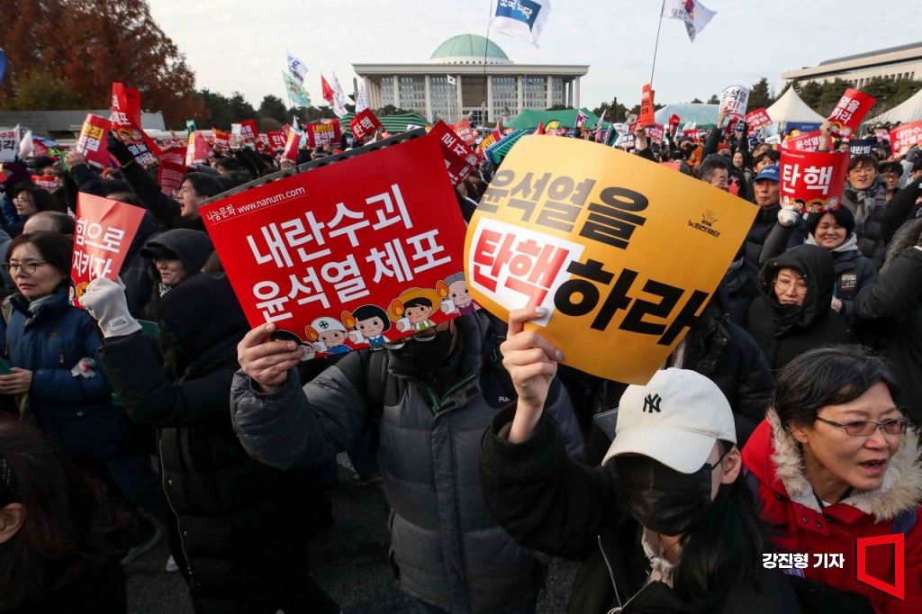 윤석열 대통령 탄핵소추안 표결일인 7일 서울 여의도 국회 앞에서 시민들이 윤 대통령의 탄핵을 촉구하고 있다.