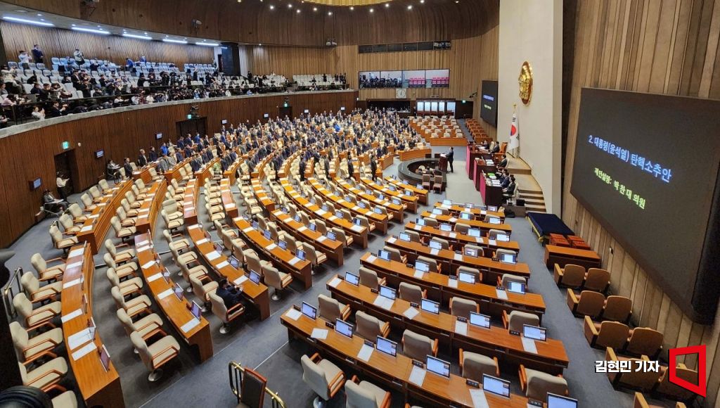 7일 국회 본회의에서 야당 의원들이 윤석열 대통령의 탄핵소추안 표결에 불참하기 위해 퇴장한 국민의힘 의원들의 이름을 일일이 호명하고 있다. 국민의힘 의원석에는 안철수 의원이 홀로 앉아 있다.