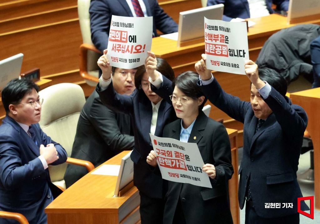 진보당 윤종오, 전종덕, 정혜경 의원이 의원이 7일 국회에서 열린 본회의에서 국민의힘 의석을 향해 손팻말을 들어 보이고 있다.