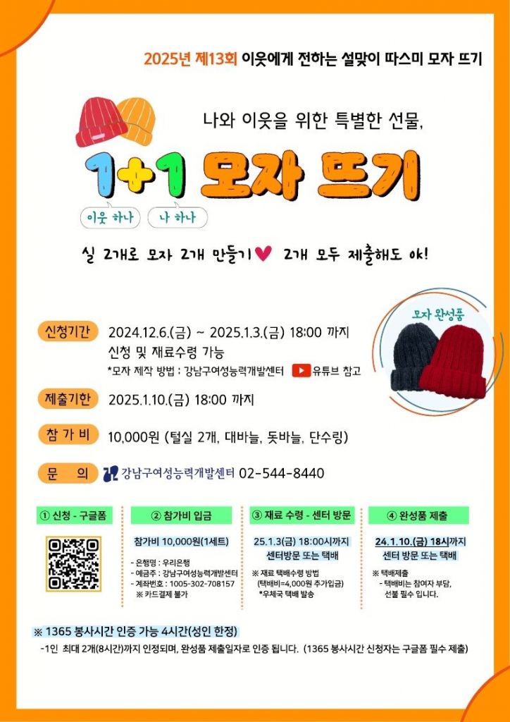 참가자는 모자 1개당 봉사시간 4시간을 인정받을 수 있으며, 최대 2개까지 제출할 수 있다. 완성된 모자는 내년 1월 10일 오후 6시까지 센터로 보내면 된다. 이렇게 완성된 따스미 모자는 관내 사회복지시설을 통해 소외된 이웃들에게 전달된다. 행사와 관련한 자세한 문의는 강남구여성능력개발센터 홈페이지와 전화로 확인할 수 있다.