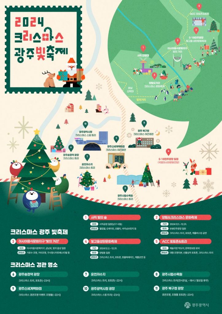 광주시청 잔디광장 크리스마스 스윙, 광주송정역 광장 크리스마스트리, 광주시립수목원 전시온실 크리스마스트리, 북구청 광장 크리스마스 야간경관, 운천저수지 크리스마스트리, 광주신세계백화점 야간경관 등 광주 곳곳이 아름다운 조명과 포토존으로 꾸며진다.