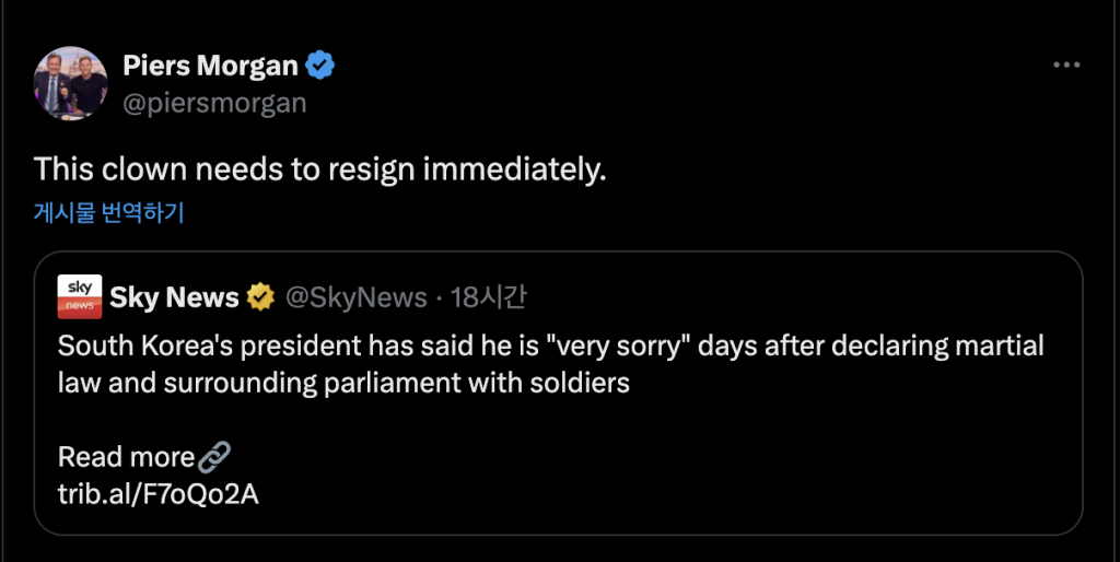 이에 영국의 언론인 피어스 모건은 7일(현지시간) 자신의 사회관계망서비스(SNS)에서 윤석열 대통령의 담화와 국회의 탄핵 투표 부결 등 한국의 소식을 전한 영국 ‘스카이스포츠’ 뉴스를 공유했다.