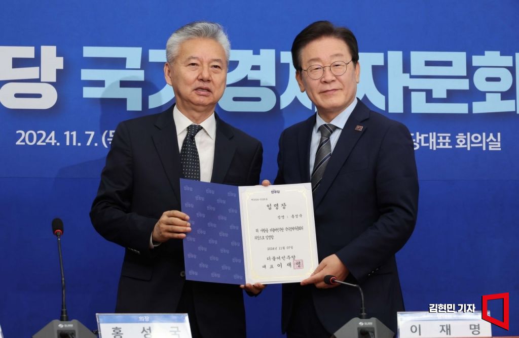 이재명 더불어민주당 대표가 7일 국회에서 열린 국가경제자문회의 출범식에서 홍성국 의장에게 임명장을 수여하고 있다. 김현민 기자