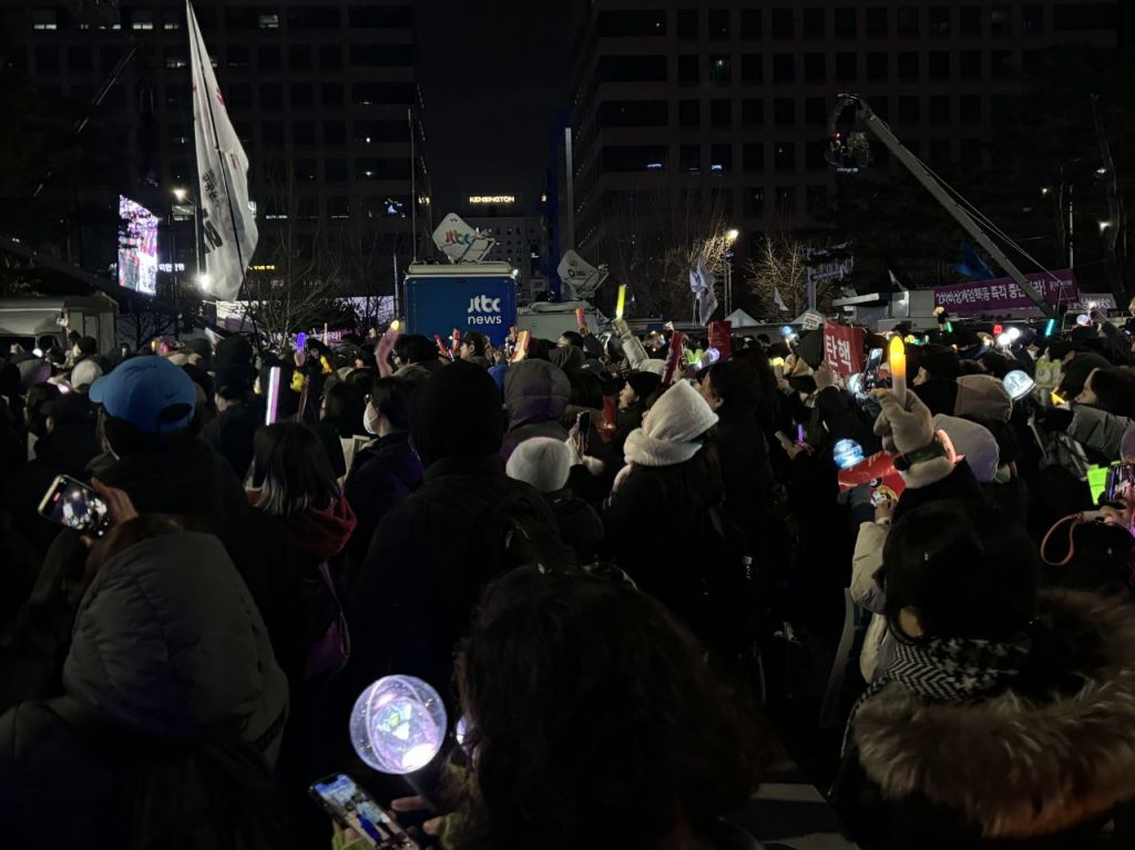 서울 영등포구 국회의사당 앞에서 열린 윤석열 대통령 퇴진 집회에서 MZ세대(밀레니얼+Z세대)들이 아이돌 응원봉을 흔들고 있다. 염다연 기자