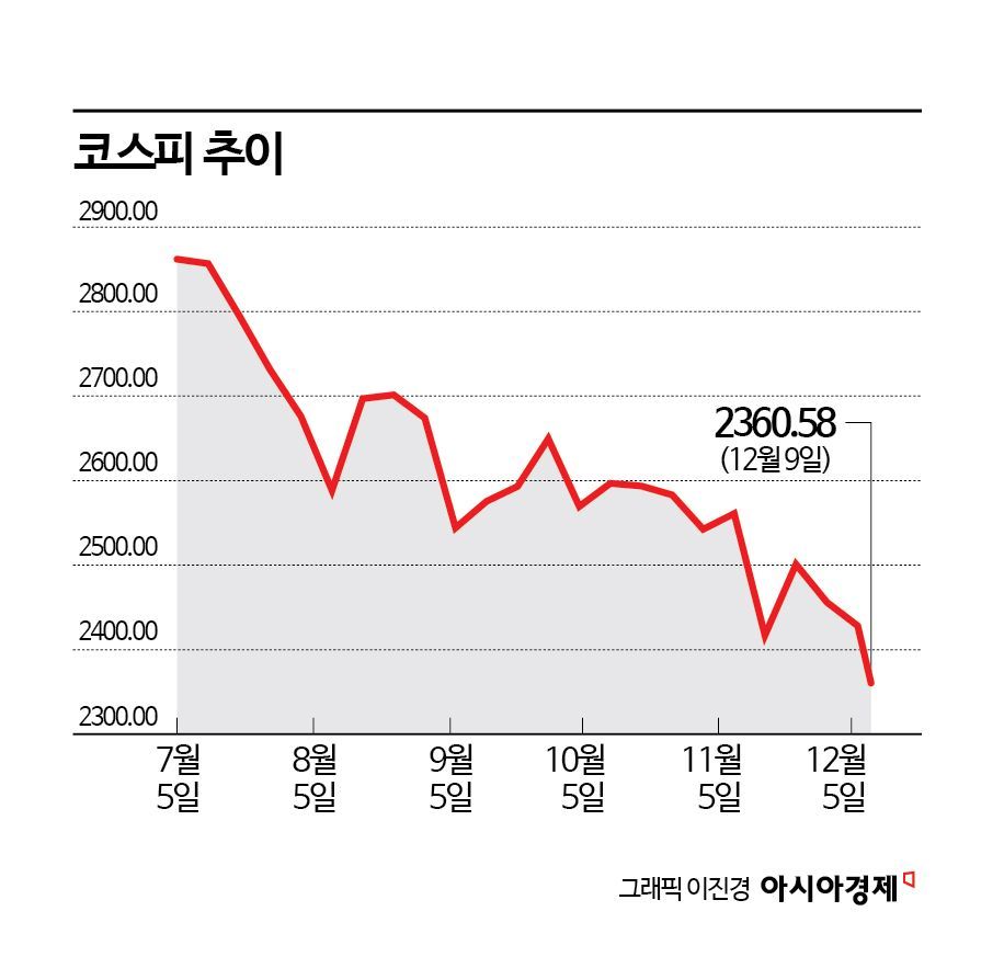 10일 한국거래소에 따르면 전날 코스피는 전 거래일 대비 67.58포인트(2.78%) 하락한 2360.58에 거래를 마치며 연저점을 경신했다. 특히 개인투자자의 투매가 두드러졌다. 이날 외국인은 1010억원, 기관은 6918억원을 순매수했으나 개인은 8896억원을 순매도했다. 지난 7일 윤석열 대통령의 탄핵소추안 부결로 탄핵 정국이 장기화할 조짐을 보이자 개인들마저 등을 돌리며 변동성이 크게 확대된 모습이다.