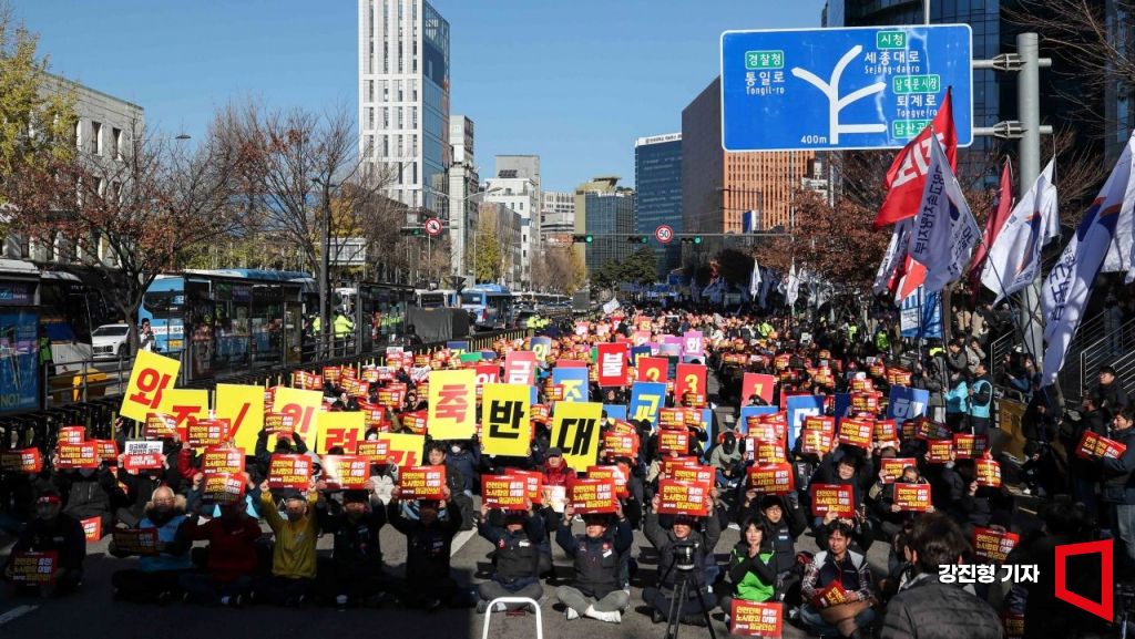 지난 5일 서울 중구 서울역 인근에서 철도노조 조합원들이 총파업 출정식을 열고 임금 2.5% 인상과 4조 2교대 전면 실시 등을 촉구하고 있다. 강진형 기자