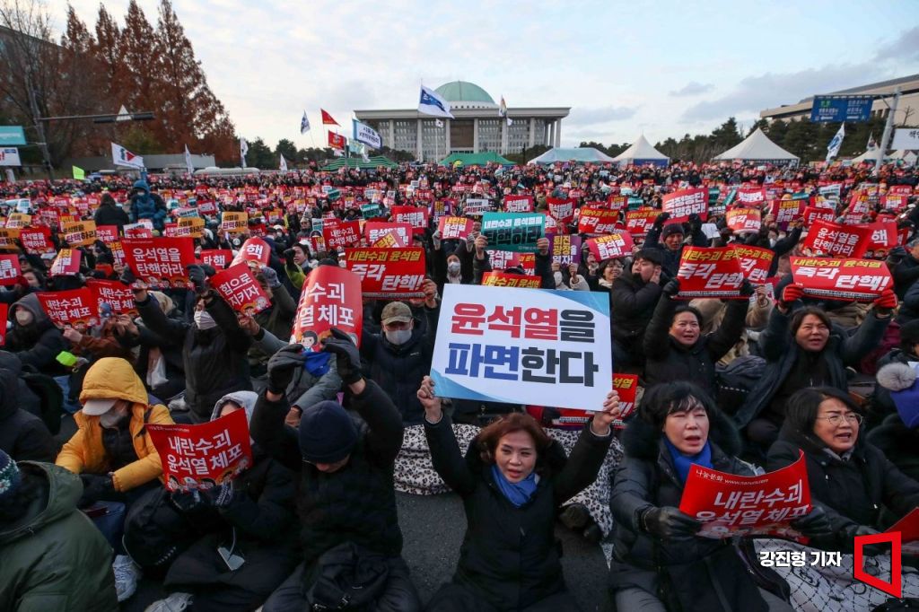 윤석열 대통령 탄핵소추안 표결일인 7일 서울 여의도 국회 앞에서 시민들이 윤 대통령의 탄핵을 촉구하고 있다. 강진형 기자