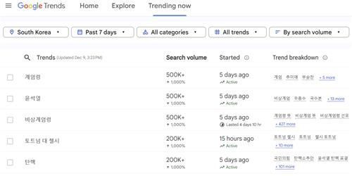 '구글 트렌드' 검색 데이터에 따르면, 지난 2일부터 9일까지 일주일간 국내 검색량이 최다 폭으로 늘어난 단어는 '계엄령'과 '윤석열'이었다. 두 단어는 일주일 사이 각각 50만번 이상 검색됐다. 평상시 검색량 대비 무려 1000% 급증한 수치다.