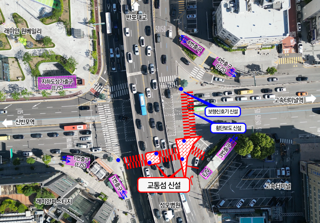 기존 북, 서 방향에 더해 이번 남, 동 방향 횡단보도까지 신설되면 ‘□’자형의 완전한 교차로 횡단보도가 돼 고속터미널과 한강공원을 방문하는 주민들이 편리하게 이용할 수 있을 것으로 기대된다.