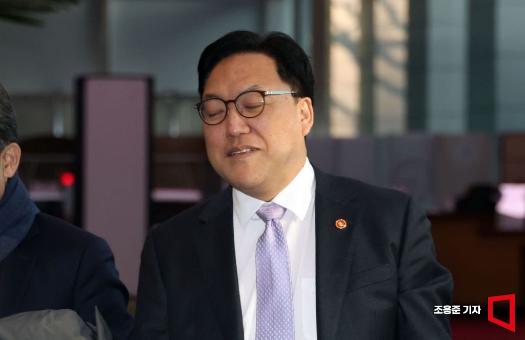 김병환 금융위원회 위원장이 10일 서울 종로구 정부서울청사로 출근하고 있다.