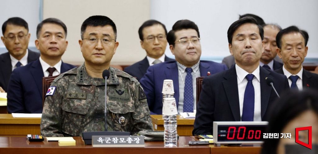 계엄군 사령관을 맡았던 박안수 육군참모총장과 김선호 국방부 차관이 5일 국회에서 열린 국방위원회 긴급 현안질의에 참석하고 있다. 김현민 기자