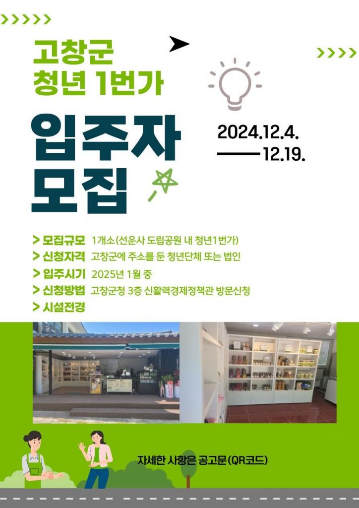 전북 고창군이 오는 19일까지 ‘청년 1번가(청년상점)’에 입주할 청년단체를 모집한다.