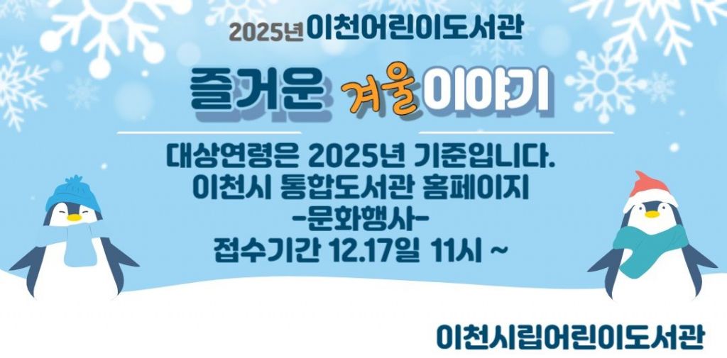 경기도 이천시 어린이도서관은 겨울방학을 맞아 다음 달 14일부터 24일까지 '즐거운 겨울 이야기' 프로그램을 운영한다.