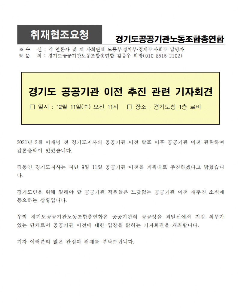 경기도공공기관노동조합총연합이 11일 공공기관 북부 이전 관련 기자회견을 개최한다. 개최 안내 보도자료