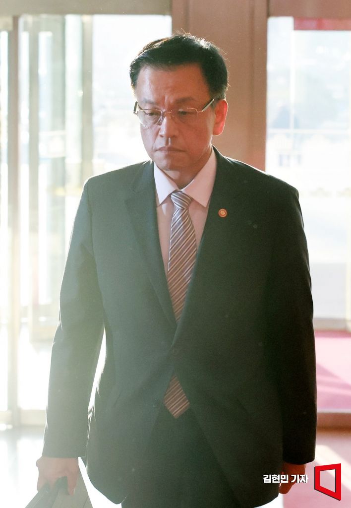최상목 경제부총리 겸 기획재정부 장관이 10일 기획재정위원회 전체회의 참석을 위해 국회로 들어서고 있다.