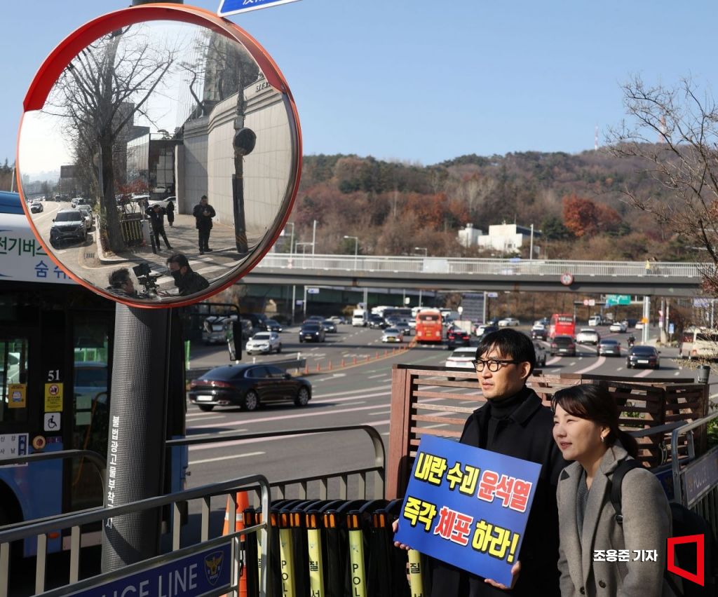 한때 대통령 전용기가 이륙했다는 소식이 전해지면서 윤석열 대통령 출국 소동이 벌어진 10일 서울 한남동 대통령 관저 인근에서 변호사모임에서 나왔다고 밝힌 시민들이 윤 체포 촉구 집회를 하고 있다.