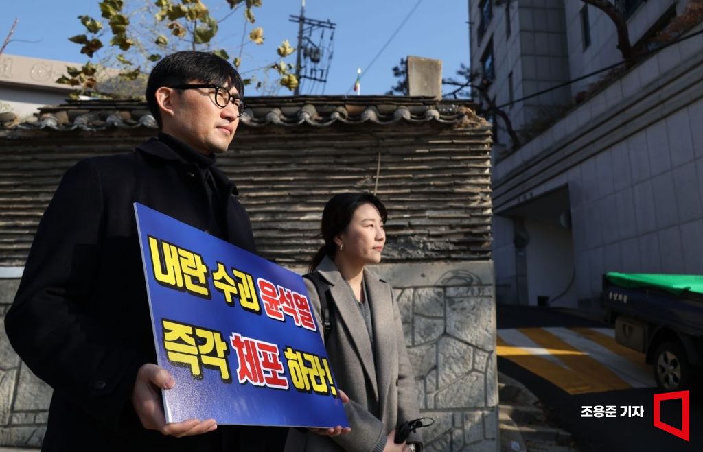 한때 대통령 전용기가 이륙했다는 소식이 전해지면서 윤석열 대통령 출국 소동이 벌어진 10일 서울 한남동 대통령 관저 인근에서 변호사모임에서 나왔다고 밝힌 시민들이 윤 체포 촉구 집회를 하고 있다.