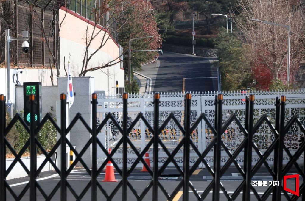 한때 대통령 전용기가 이륙했다는 소식이 전해지면서 윤석열 대통령 출국 소동이 벌어진 10일 서울 한남동 대통령 관저 입구에 바리게이트가 설치 되어 있다.