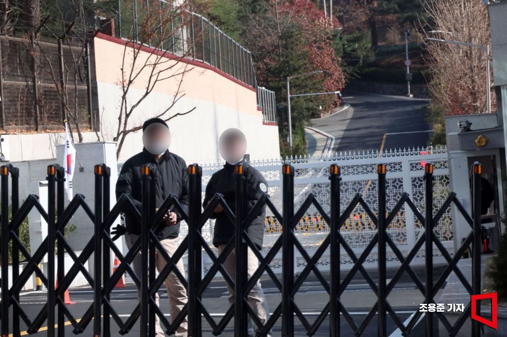 한때 대통령 전용기가 이륙했다는 소식이 전해지면서 윤석열 대통령 출국 소동이 벌어진 10일 서울 한남동 대통령 관저 입구에 바리게이트가 설치 되어 있다.