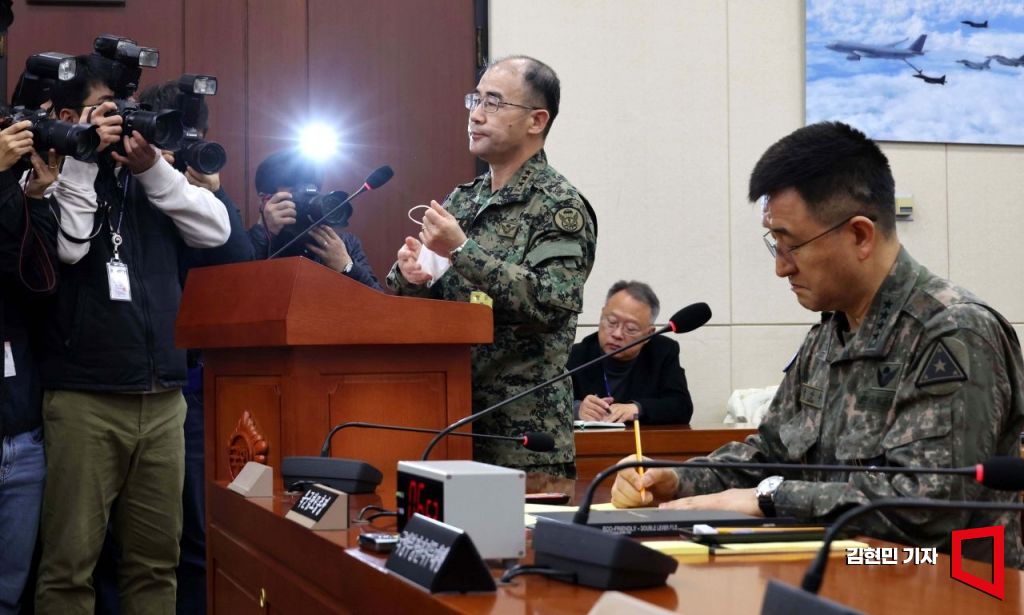 곽종근 육군 특수전사령관이 10일 국회 국방위원회에서 열린 비상 계엄 관련 현안질의에 출석해 발언 도중 성일종 위원장의 요구로 마스크를 벗고 있다.