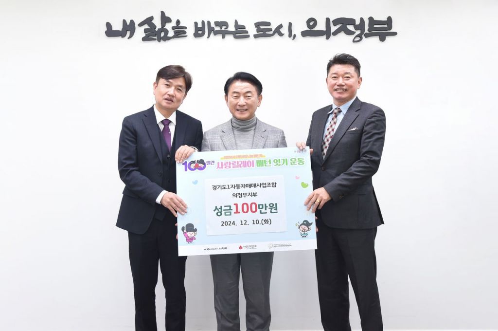 경기 의정부시(시장 김동근)는 10일 경기도1자동차매매사업조합 의정부지부(지부장 김인중)가 ‘100일간 사랑릴레이 배턴 잇기’에 동참해 성금 100만원을 기부했다고 밝혔다.