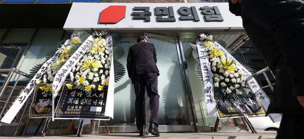 10일 대구 수성구 국민의힘 대구시당 앞에 시민들이 보낸 국민의힘 규탄 근조화환이 설치돼 있다. 연합뉴스