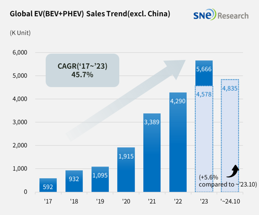 10일 SNE리서치에 따르면 올해 1~10월 중국을 제외한 글로벌 전기차(BEV+PHEV 포함) 등록 대수는 483만5000대로 전년 동기 대비 5.6% 증가했다.
