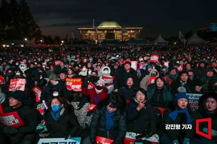 윤석열 대통령 탄핵소추안 표결일인 7일 서울 여의도 국회 앞에서 시민들이 국민의힘 의원들이 탄핵소추안 표결에 참여하지 않고 퇴장하는 모습을 시청하며 침통한 표정을 짓고 있다. 강진형 기자