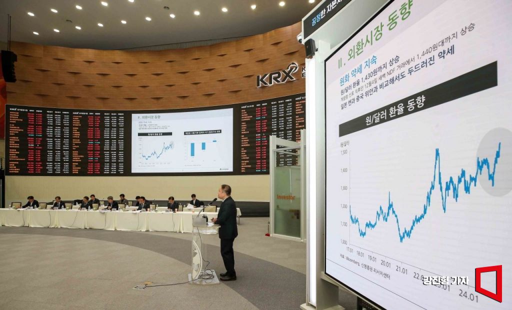 더불어민주당, 조국혁신당, 사회민주당 등 야3당 국회 정무위원회 의원들이 10일 서울 여의도 한국거래소에서 열린 '자본시장 현안대응 및 현장점검'에 참석해 김학균 신영증권 리서치센터장의 자본시장 현안에 대한 설명을 듣고 있다.