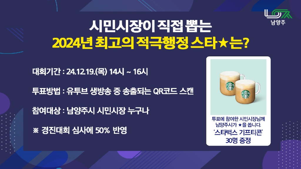 남양주시는 경진대회서 현장 시민심사단 평가(50%) 및 온라인 시민 투표(50%)로 순위를 결정하며, QR코드를 통해 투표에 참여한 시민 30명을 추첨해 스타벅스 기프티콘을 지급하는 이벤트도 실시할 계획이다.