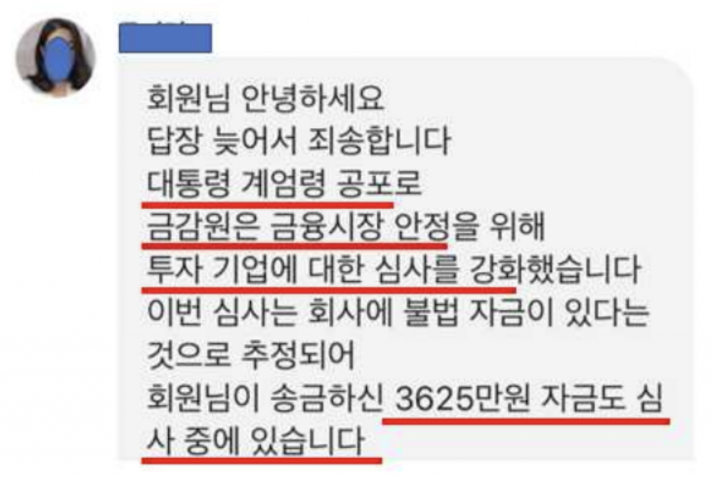 #피해자 A씨는 지난 9월 불법 리딩방에 접속한 뒤 가짜 모바일트레이딩시스템(MTS)에서 투자를 시작했다. 사기단은 초기 투자자금 없이 1억원 가까이 수익을 낸 것처럼 꾸민 뒤 피해자가 수익금 출금을 신청하면 윤석열 대통령의 비상계엄령 선포를 핑계로 출금을 지연하고 추가 납입을 요구했다. 금융감독원의 자금출처 조사 요구에 따라 추가 입금이 필요하다며 자금을 편취하는 것이다.