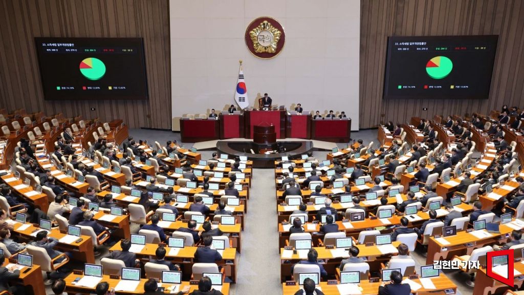 10일 국회 본회의에서 금투세 폐지·가상자산 과세 유예가 핵심인 소득세법 개정안이 통과되고 있다. 김현민 기자
