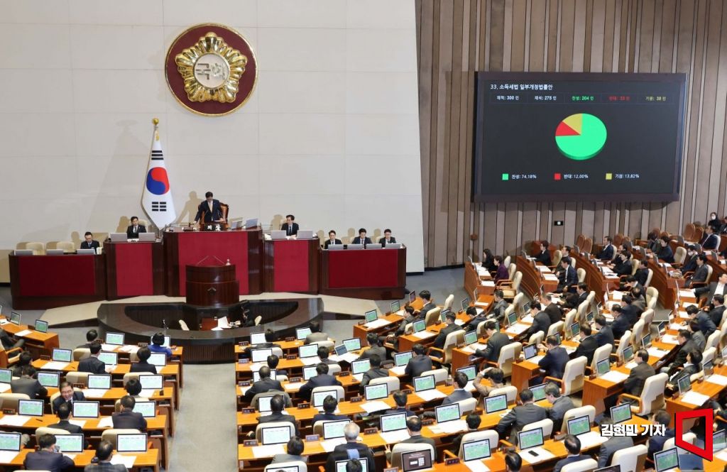 10일 국회 본회의에서 금투세 폐지·가상자산 과세 유예가 핵심인 소득세법 개정안이 통과되고 있다. 김현민 기자