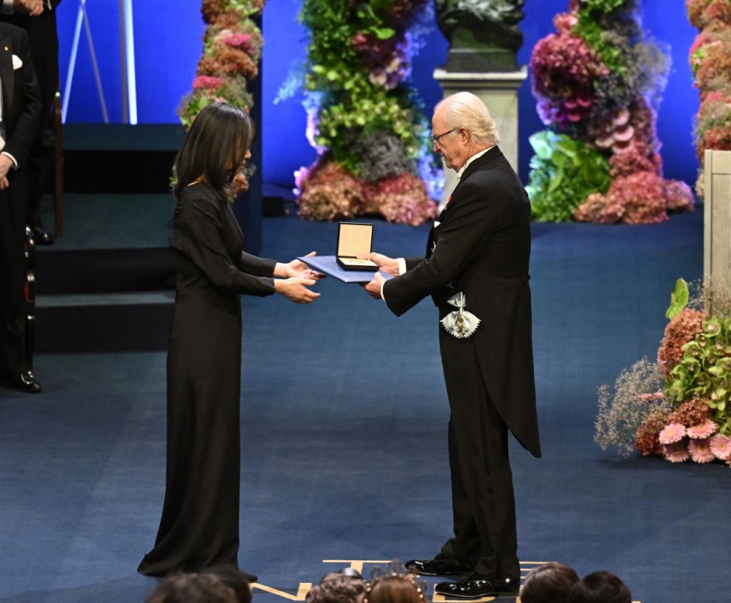 소설가 한강이 검정색 드레스를 입고 한국인 최초이자 아시아 여성 최초로 노벨문학상을 받았다.