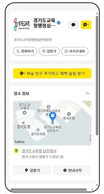 카카오톡 검색창에 ‘경기도교육청행정심판위원회’를 검색한 뒤 친구 추가를 하면 경기도교육청 행정심판에 대한 자세한 정보를 얻을 수 있다.