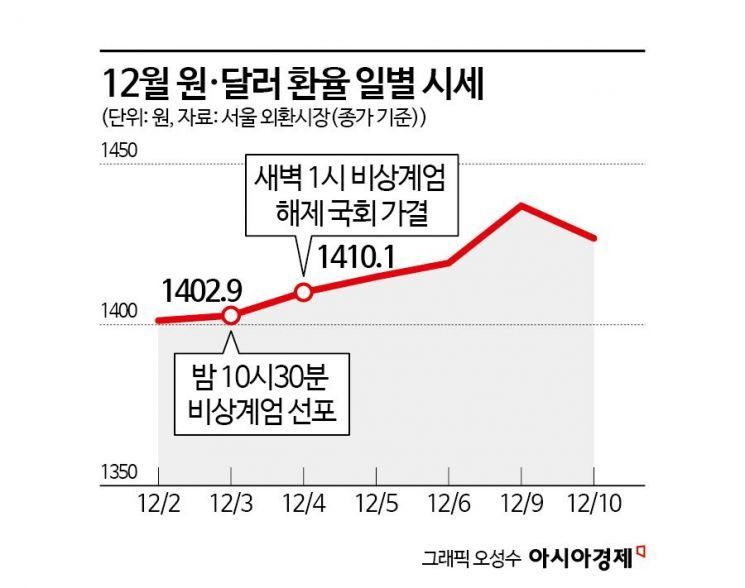 민 연구원은 "정국 불안이 금융시장으로 전이되는 것을 최소화하고자 당국은 적극적인 안정화 의지를 연일 피력하고 있다"며 "1430원대에서 실개입 경계 수위가 높아지면서 롱심리 과열을 억제해줄 수 있고, 총알이 충분한 수출업체 이월 네고도 환율 상승폭을 제한하는 요인으로 작용할 수 있다"고 설명했다.
