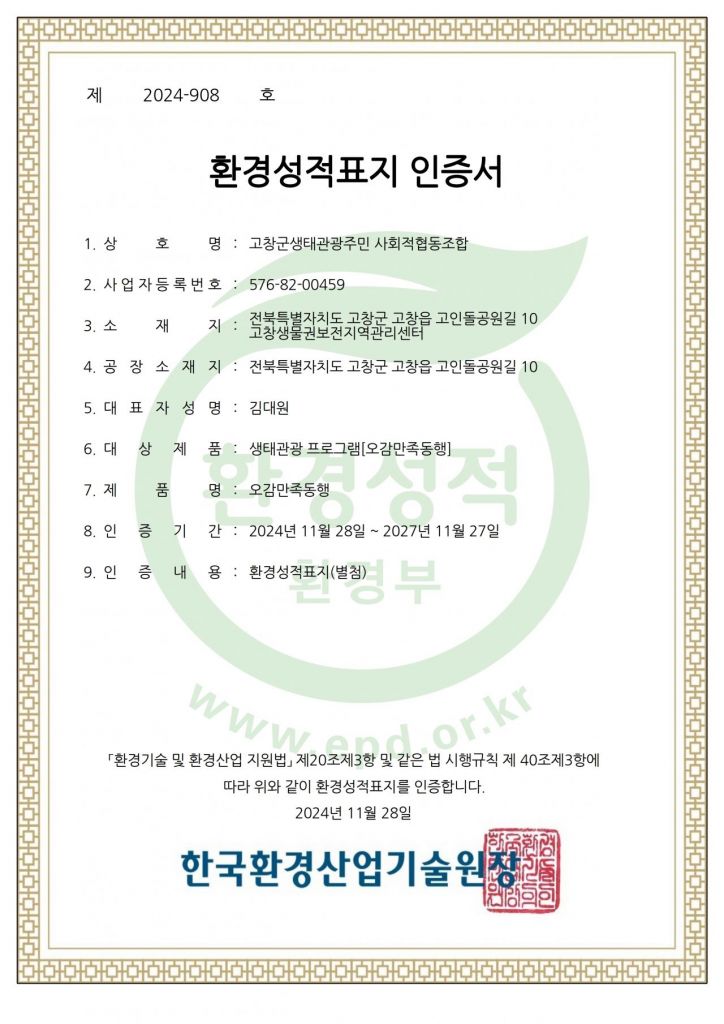 전북 고창군 운곡람사르습지 대표 탐방프로그램인 ‘오감만족동행’이 환경부 환경성적표지 인증을 받았다.